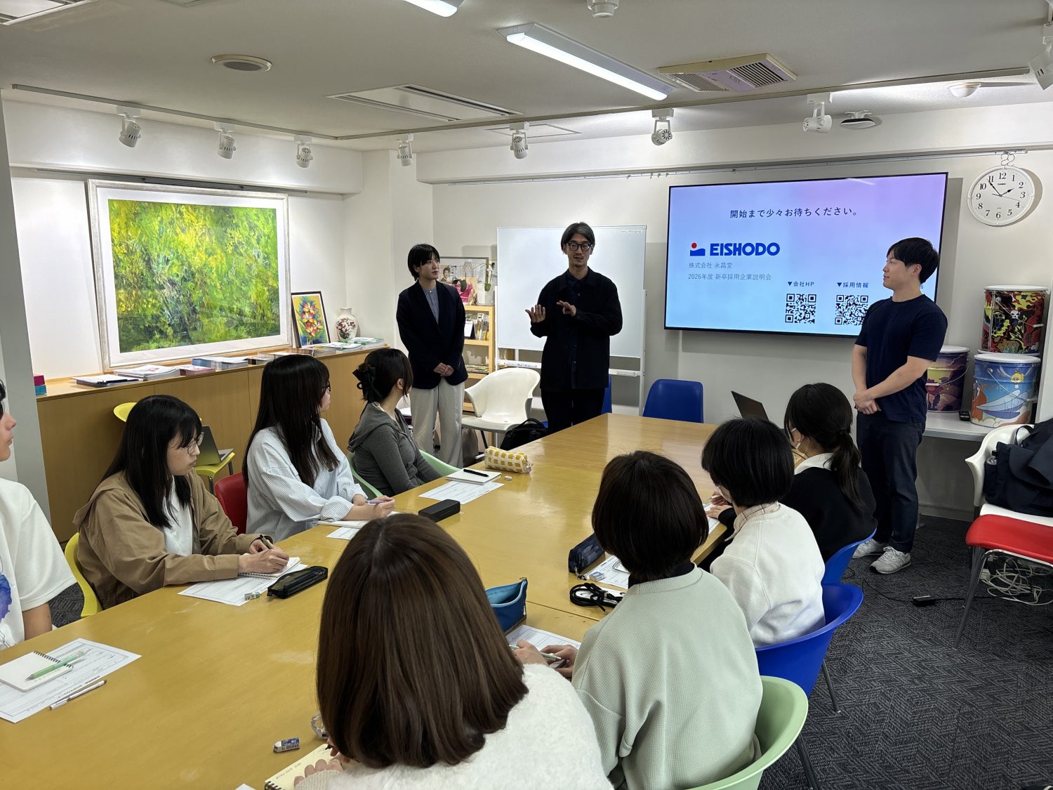 印刷や広告、デザインを手掛ける株式会社永昌堂の採用ご担当者さまをお招きし、企業説明会を行いました。説明会では、印刷業界の最新の動きやデザインの仕事のやりがい、チームで一つの作品をつくり上げる面白さなどをお話しいただきました。