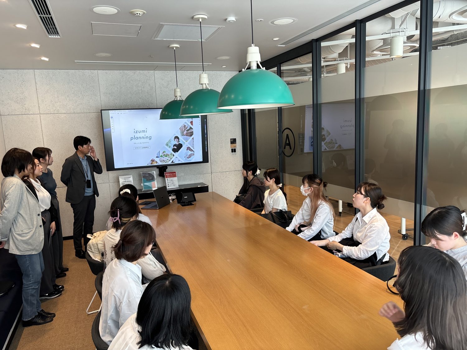 広告・出版・販促など幅広い分野で活躍する「株式会社いづみ企画」を訪問し、企業見学を行いました。社屋改装中のため、コワーキングスペースでの開催になりました。